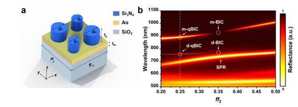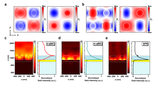 为了深入分析混合型超表面的光学性质,我们计算了本征模场和电场模响应。图2a和b为BICs模式本征模场的面内分量,这些呈反对称分布的面内分量与辐射分量的对称性失配,说明BICs模式属于对称保护型(symmetry-protected)。图2c-d展示了各模式的电场模响应,d-qBIC模式的电场集中分布在Si3N4圆柱顶端和内部,具有导模共振特点;而m-qBIC的电场集中分布在金膜与Si3N4层交界处,与图2e所示的表面等离激元共振类似。这种差异说明了d-qBIC与m-qBIC模式是分别由光子特征与等离激元特征所主导激发的。