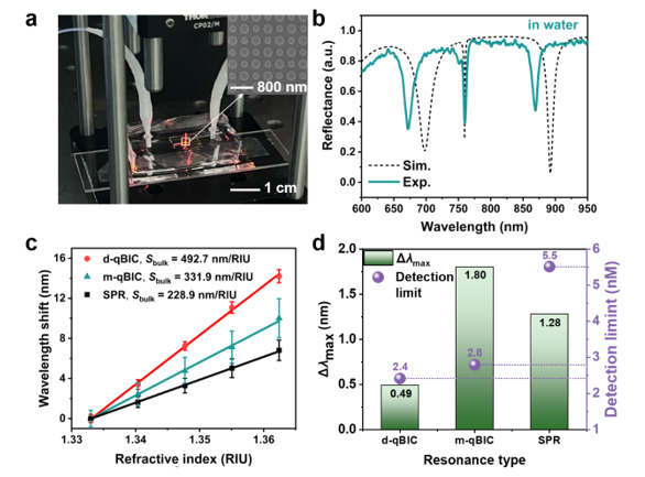 图3a展示了集成混合型超表面的PDMS微流控芯片,图3b-d展示了对混合型超表面的光谱测试、体折射率灵敏度测试和生物素-链霉亲和素特异性传感实验。实验结果显示,在正入射和液体环境下,由光子特征主导的d-qBIC模式实现了412的高Q因子和优越的传感性能,其中体折射率灵敏度为492.7 nm/RIU,FOM为266.3 RIU–1;由等离激元特征主导的m-qBIC模式在检测链霉亲和素时实现了1.8 nm的共振偏移量,展现出更强的表面亲和力。